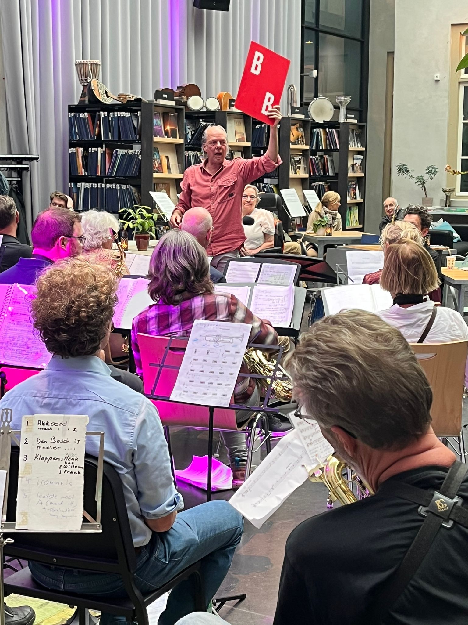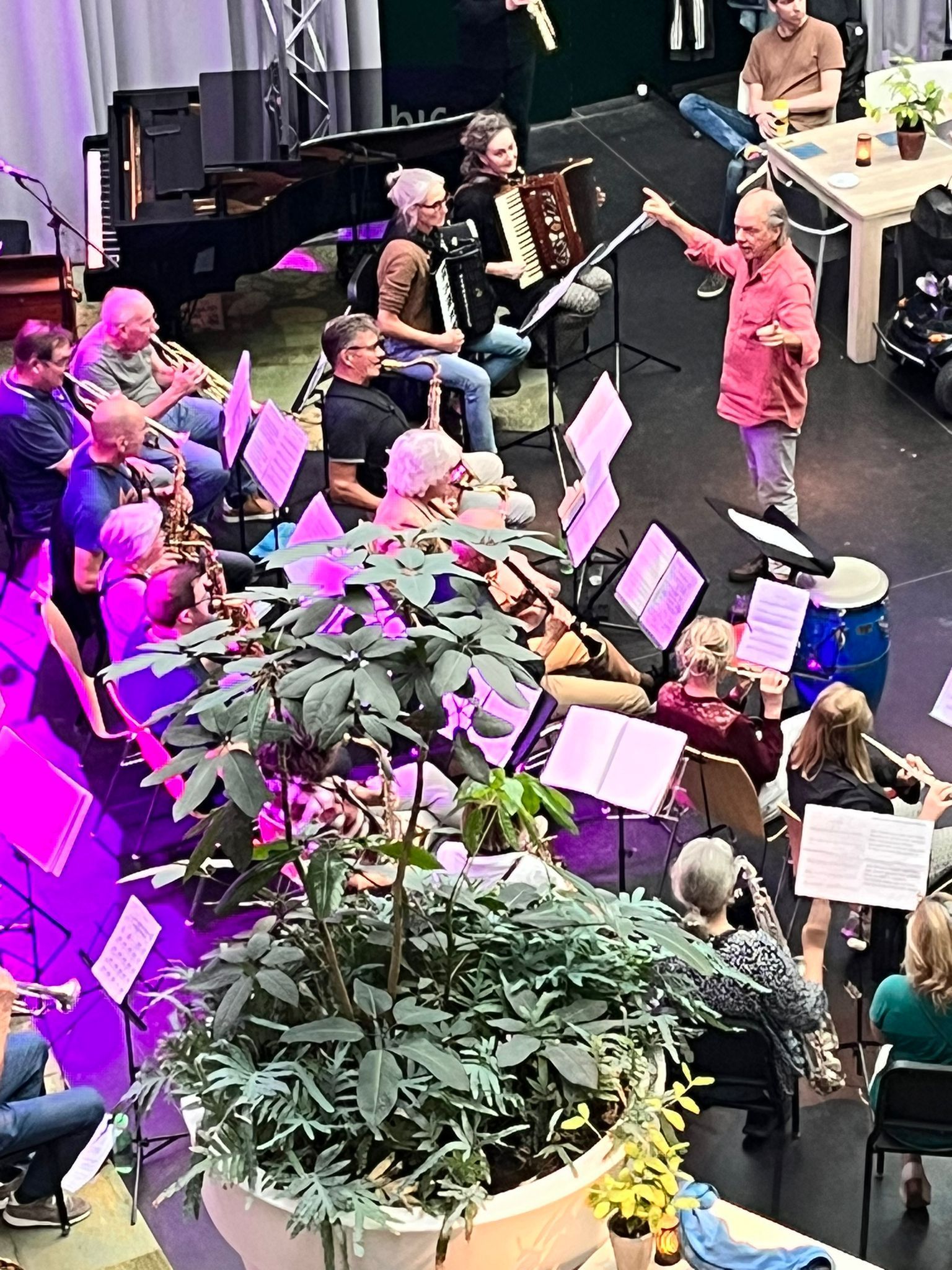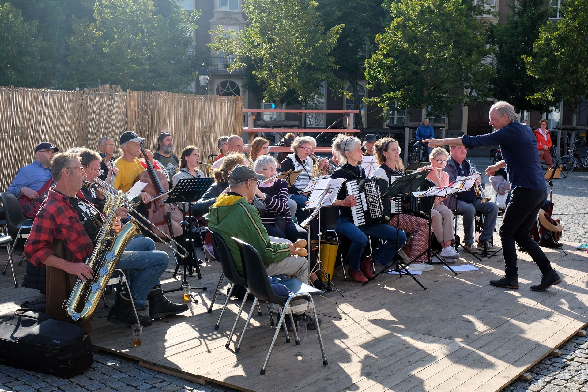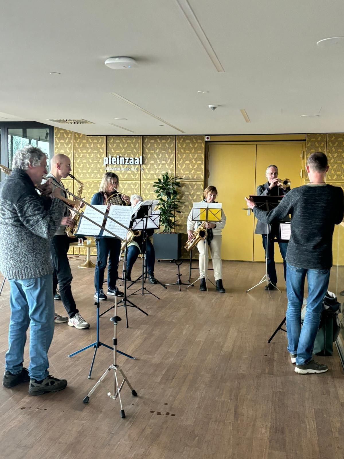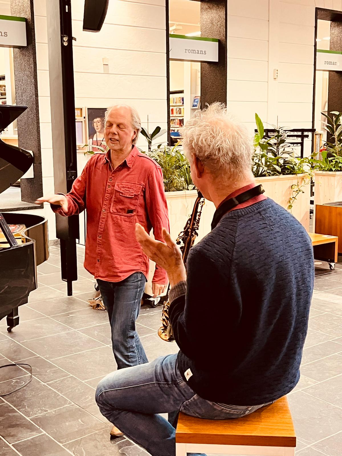 Bart van Dongen repeteert de groep een aantal eenvoudige thema’s die ter plekke vervlochten worden tot een geheel.