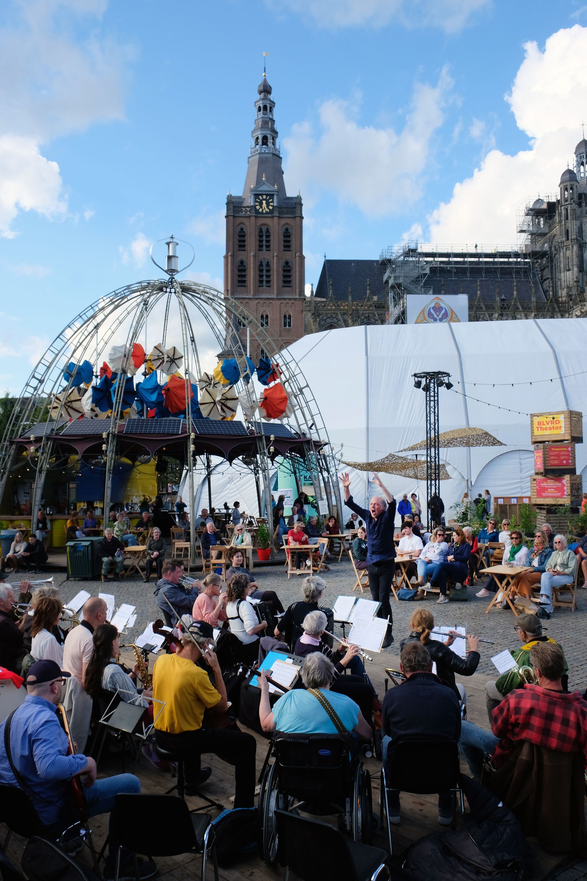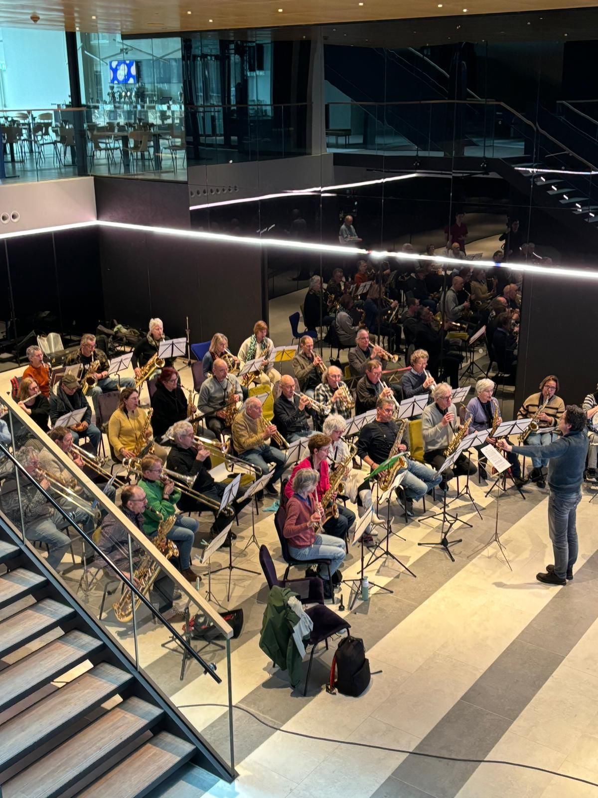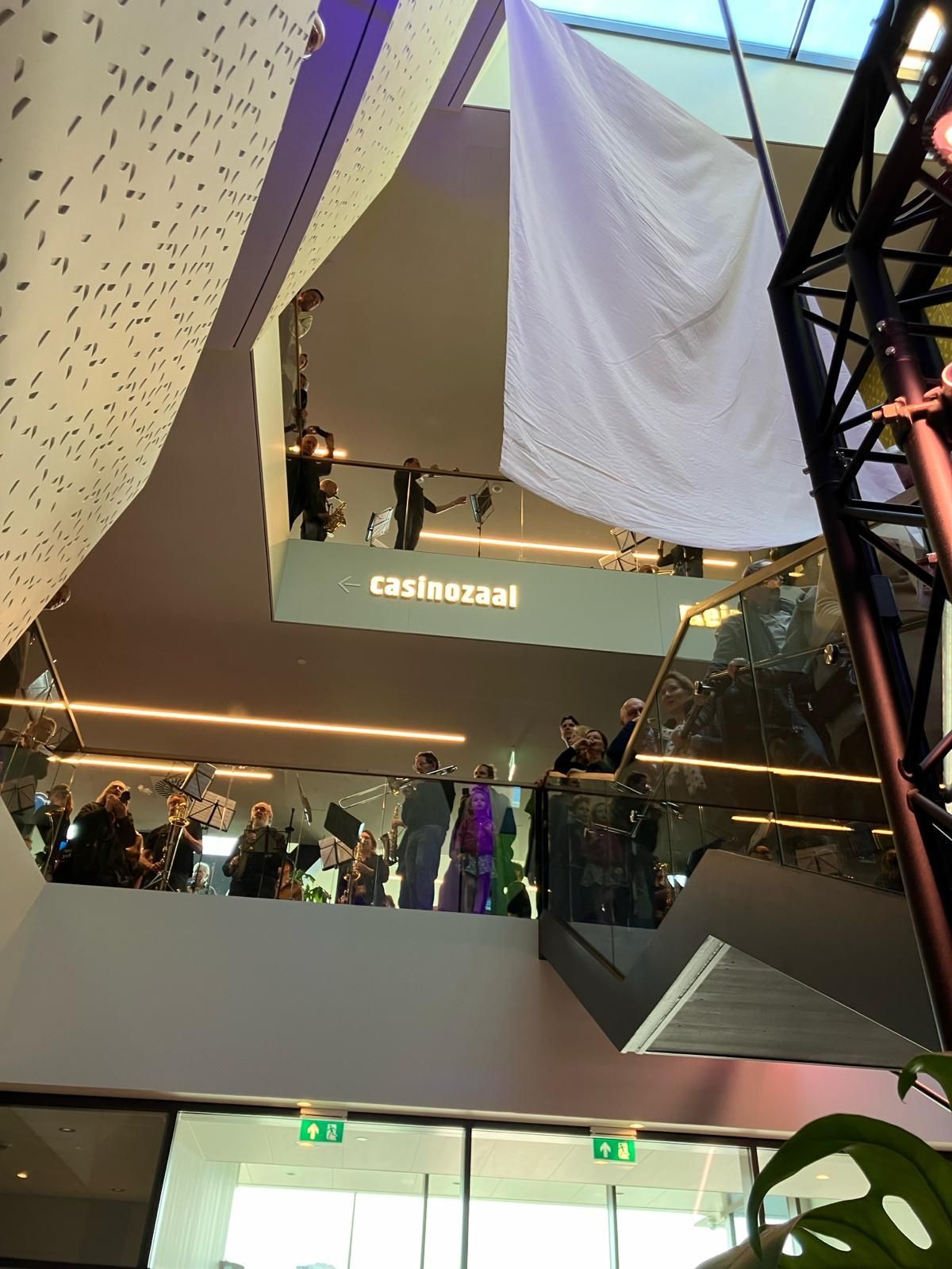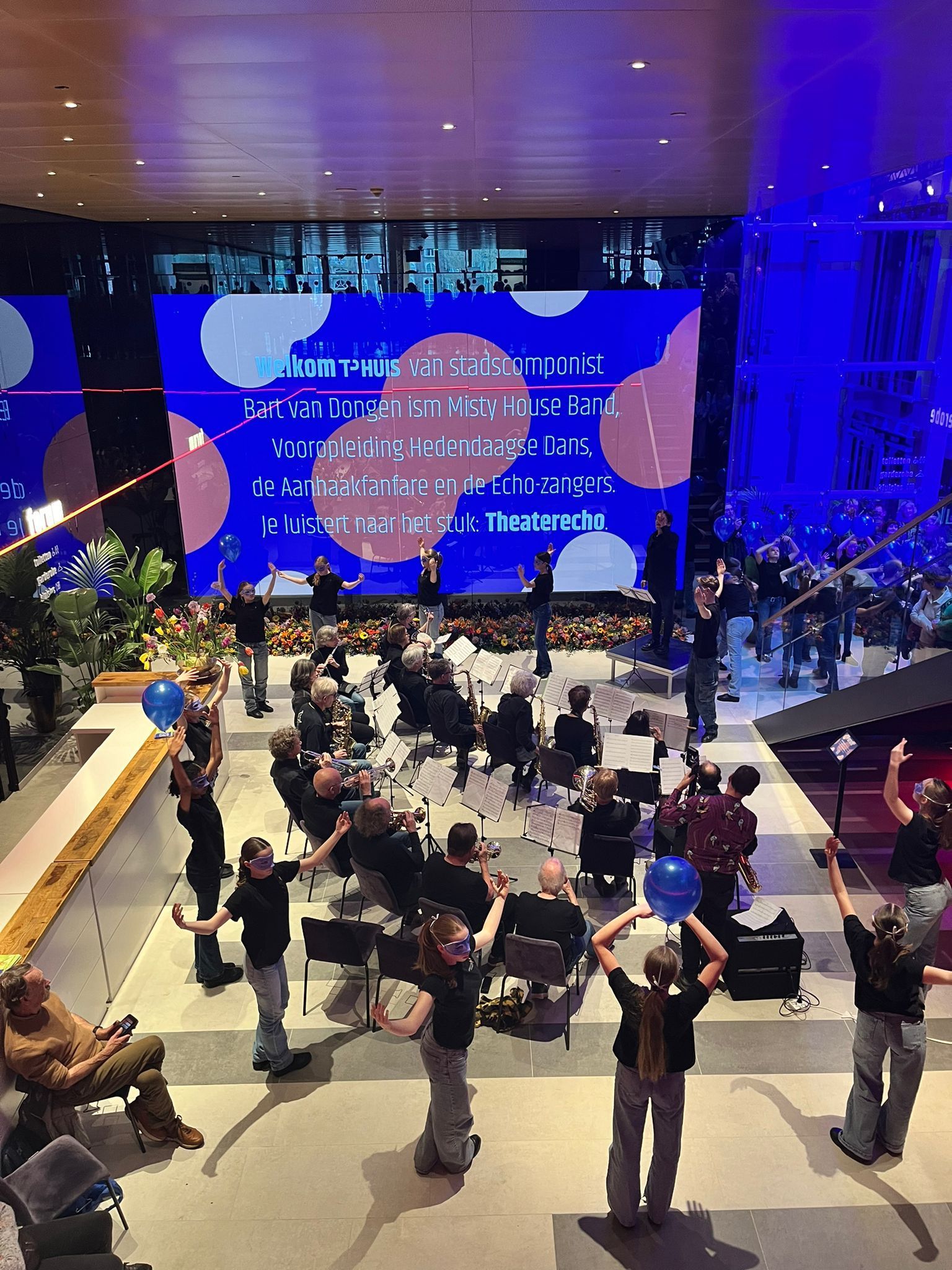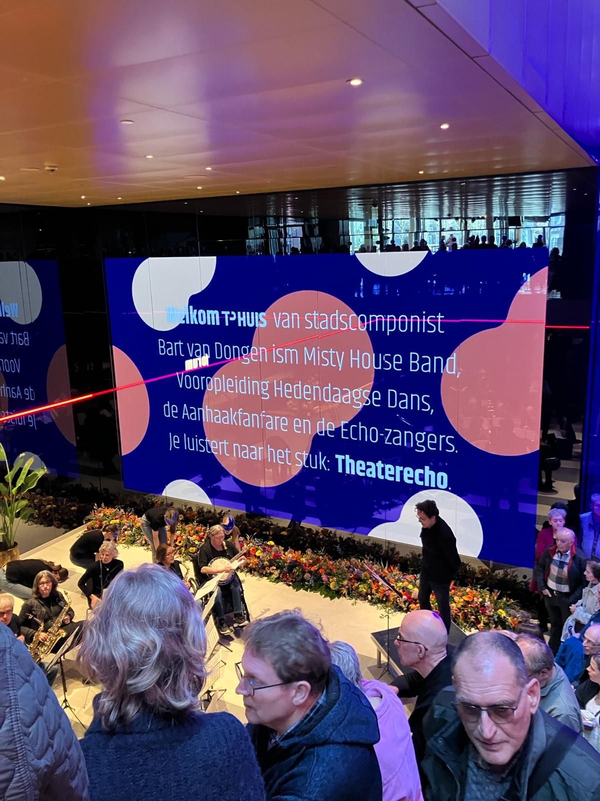 Toch bijzonder.. Het nieuwe Theater aan de Parade mogen overnemen met een band, orkest, koor en dansgroep. Voor de opening op 3 maart, werd Theaterecho uitgevoerd met de Misty House Band (o.l.v. Edward Capel), de Aanhaak Fanfare bestaande uit vele amateurmusici (o.l.v. Simon Bruul en Hans Sparla), Echo Koor (o.l.v. Vincent Roes en Bart van Dongen) en Vooropleiding Hedendaagse Dans (o.l.v. Geraldine van de Griend). Met deze samenwerking een echt gezamenlijk kunstwerk van de stad, weerklinkend op meerdere verdiepingen en onverwachte plekken in het gebouw. Een muzikale kathedraal bestaande uit verschillende bouwstenen. Bart schreef ook de compositie.